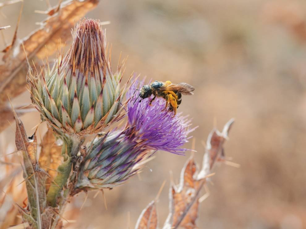 Trabajamos en agricultura ecológica sin herbicidas ni insecticidas químicos, favoreciendo cultivos que alimentan a las abejas y mantienen la biodiversidad.