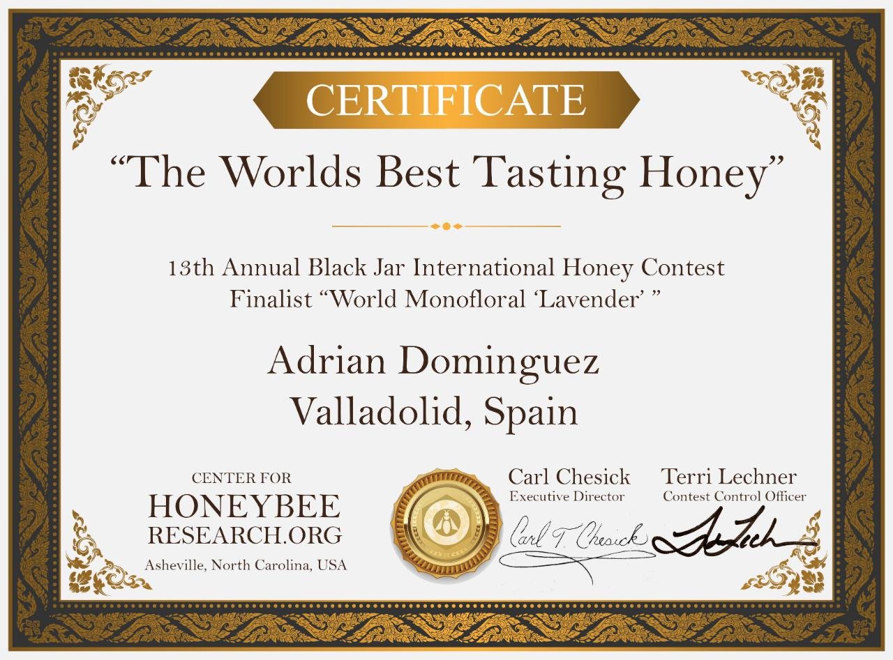 Este diploma es un reconocimiento otorgado a Adrián Domínguez, fundador de Pecorea, como finalista en la categoría «World Monofloral ‘Lavender’» en la 13ª edición del Concurso Internacional de Miel Black Jar. Recibimos el título certificado como «The World’s Best Tasting Honey» (La miel con el mejor sabor del mundo), destacando la miel monofloral de lavanda de Pecorea como una de las mejores a nivel internacional.